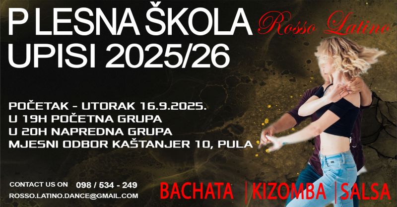 – Latino – caribbean grupe – (Početna i napredna) – Naučit ćete, a napredni usavršiti, salsu, bachatu i kizombu, sembu uz osnove ostalih plesova kao što su 𝐜𝐡𝐚 𝐜𝐡𝐚 𝐜𝐡𝐚, samba, i ostale.